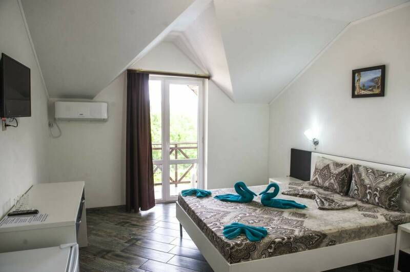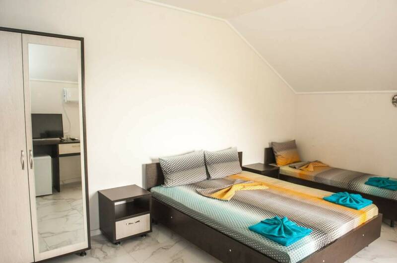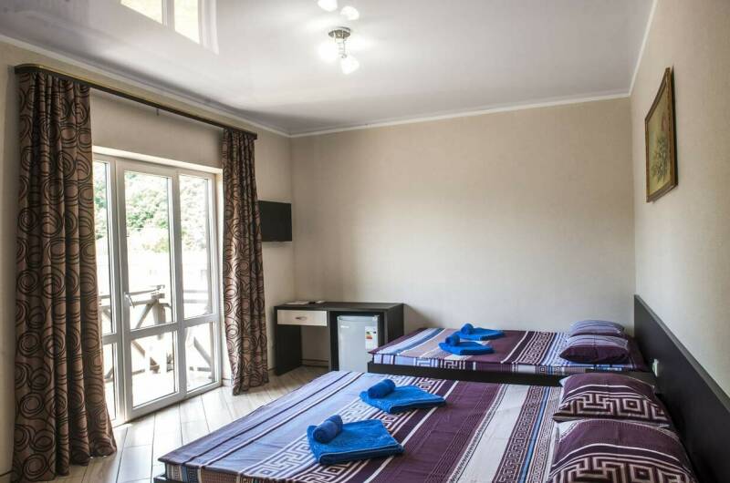-Комфортабельные номера, в которых имеется: кондиционер, собственная холодильная камера, телевизор, отдельный санузел. Имеются 2-х, 3-х, 4-х, 5 местные номера с балконом и дом под ключ.